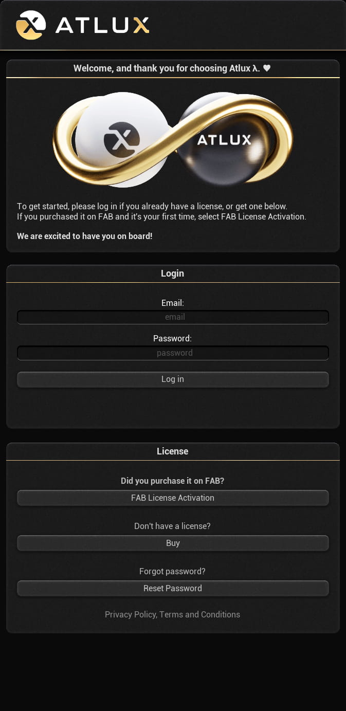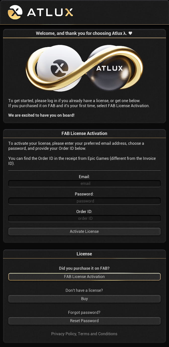 If you purchased the plugin on FAB and this is your first time using Atlux, click on FAB License Activation. Then enter your preferred email address, choose a password, and provide your Order ID, which you can find in your Epic Games receipt email or in your FAB purchase history.