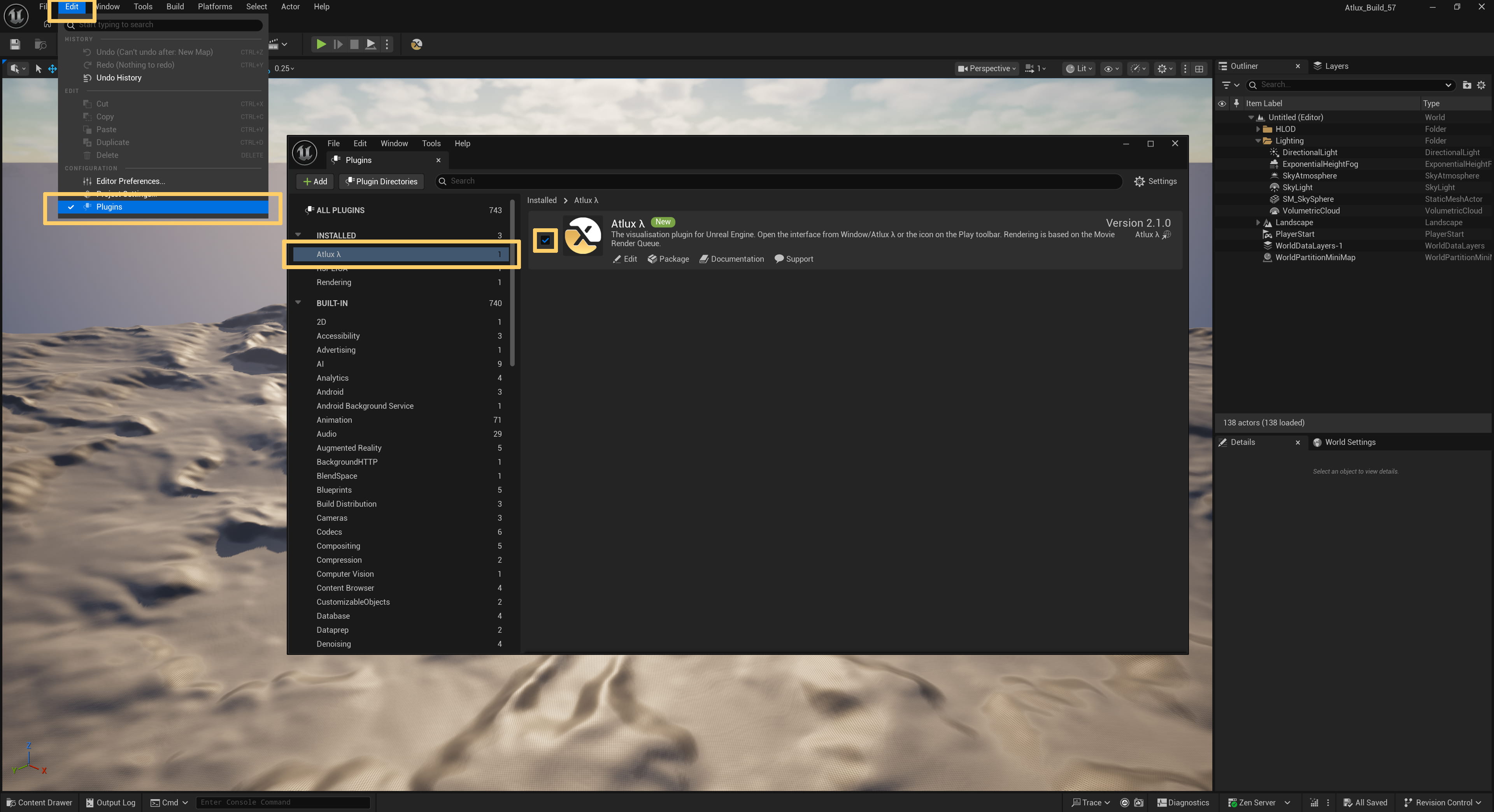 After installing the plugin via the installer or the Epic Games Launcher, go to Edit/Plugins in your project. Search for Atlux, and enable the checkbox on the left.
